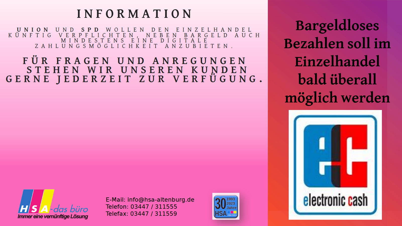 Unsere schnellen Kassen sind dank ihrer umfangreichen Funktionen und der einfachen Bedienungsweise für verschiedenste Branchen hervorragend geeignet. Ob als Kassensystem für den Einzelhandel, die Gastronomie, eine Tankstelle, einen Friseursalon oder in einem sonstigen Bereich. Unsere Kassen ermöglichen eine professionelle und schnelle Abwicklung der Verkäufe sowie der Bezahlvorgänge. Dadurch unterstützen wir Sie, einen schnellen und kompetenten Kundenservice am Kassenschalter, dem Point of Sale (PoS), zu bieten. Wir beantworten gerne Ihre Fragen rund um unser Angebot, damit Sie die richtige Auswahl für Ihren Einsatzzweck treffen. Tel.: 03447 311555 oder mail@hsa-altenburg.de